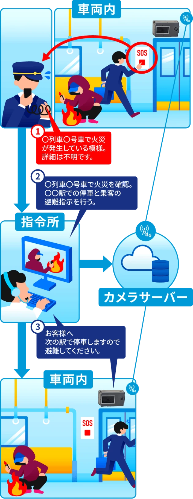 - ① 列車内の異常を乗務員などから指令へ連絡