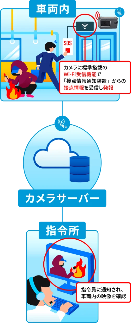 車両内と監視センター間の音声通話をカメラで実現。
